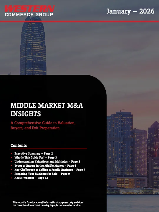 The Western Commerce Group Middle Market M&A Insights Report provides a practical roadmap for founder- and family-owned businesses preparing for sale in today’s evolving environment. Drawing upon decades of advisory experience and a proprietary review of current market data, the report distills key lessons on valuation, buyer behavior, and exit readiness for companies valued between $20M and $500M.